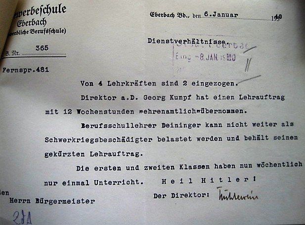 Von besonderer Auswirkung waren die Personalnöte nach dem Zweiten Weltkrieg. Bereits 1940 teilte der damalige Direktor der Gewerbeschule, Paul Kühlewein, Bürgermeister Schmeißer mit, dass wegen Militärdienstes 2 von insgesamt 4 Lehrkräften nicht verfügbar waren, und dass der ehemalige Schulleiter, Georg Kumpf, 12 Unterrichts- stunden ehrenamtlich übernommen habe. Von 1945 bis zur Besetzung der Direktoren- stelle durch Herrn Walter Beck, wurde Kumpf noch einmal durch die amerikanische Militärregierung als kommissarischer Schulleiter eingesetzt. Auch für andere Lehrer war die Wiedereinstellung in den Schuldienst nicht einfach, musste doch jeweils der Spruch- kammerbescheid abgewartet werden. So erging es Karl Jörg und dem späteren Schulleiter Robert Gröhl. Wie schwierig die Personalsituation war, zeigt auch ein Schreiben des kommissarischen Schulleiters Kumpf an Bürgermeister Nenninger vom 29. Mai 1946.