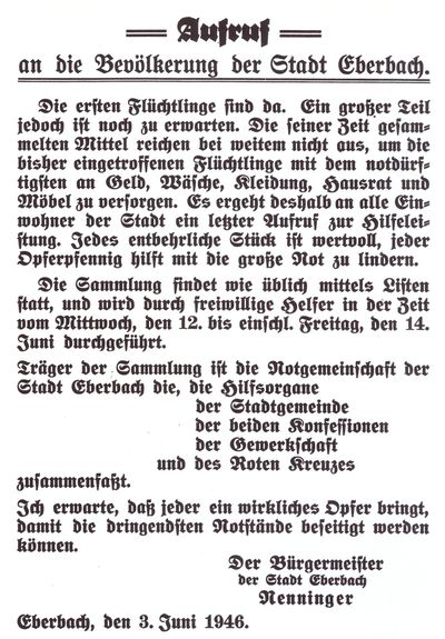 Vor 70 Jahren, am 3. Juni 1946, ruft der Eberbacher Bürgermeister zur Solidarität mit den Heimatvertriebenen auf - Insbesondere Steige und Ledigsberg wurden zur Neuen Heimat „Die ersten Flüchtlinge sind da. Ein großer Teil jedoch ist noch zu erwarten. Die gesammelten Mittel reichen bei weitem nicht auf.“ Ein letzter Aufruf zur Hilfeleistung an die Bevölkerung der Stadt Eberbach. Unterschrieben vom damaligen Bürgermeister Kurt Nenninger. Veröffentlicht am 3. Juni 1946, also jetzt vor 70 Jahren. Es fehlte das „Notdürftigste“ - Geld, Wäsche, Kleidung, Hausrat und Möbel. Eine „Notgemeinschaft der Stadt Eberbach“ sammelte für die Ankömmlinge. Die Initiatoren waren die Stadtgemeinde, beide christlichen Konfessionen, die Gewerkschaft, das Rote Kreuz.