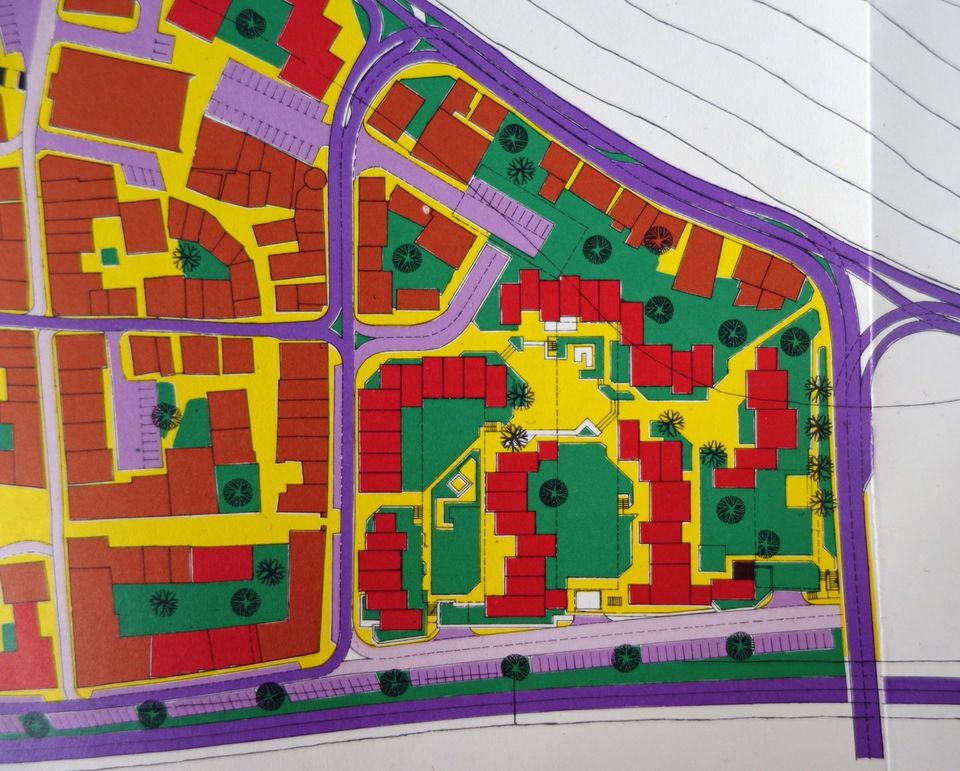 Vorschläge von 1972. Viele neue Parkplätze und der Abriss der Dr.-Weiss-Schule mit dem Neubau eines Wohnviertels (rechts neben dem Blauen Hut, Mitte).