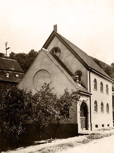 Die Eberbacher Synagoge bei der Neckarbrücke. Auf dem Dachfirst der Gesetzesstein.