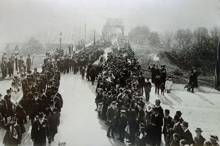 Honoratioren und Vereine beim feierlichen Marsch an der Neckarbrücke.