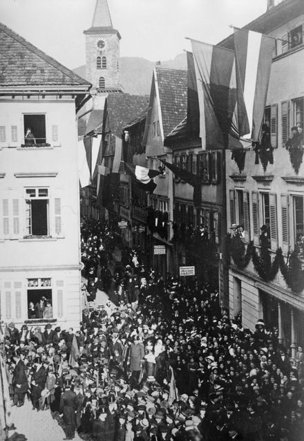 Einige wenige Bilder im Eberbacher Archiv lassen erahnen, was in der Stadt los war: Der Marsch von Honoratioren und Vereinen an der Neckarbrücke, die die Enthüllung des Denkmals für die Eberbacher Kriegsteilnehmer von 1806 bis 1815 am 18. Oktober beim damaligen Rathaus am Alten Markt, die festliche geschmückte Hauptstraße mit Fahnen und Girlanden an jedem Gebäude.