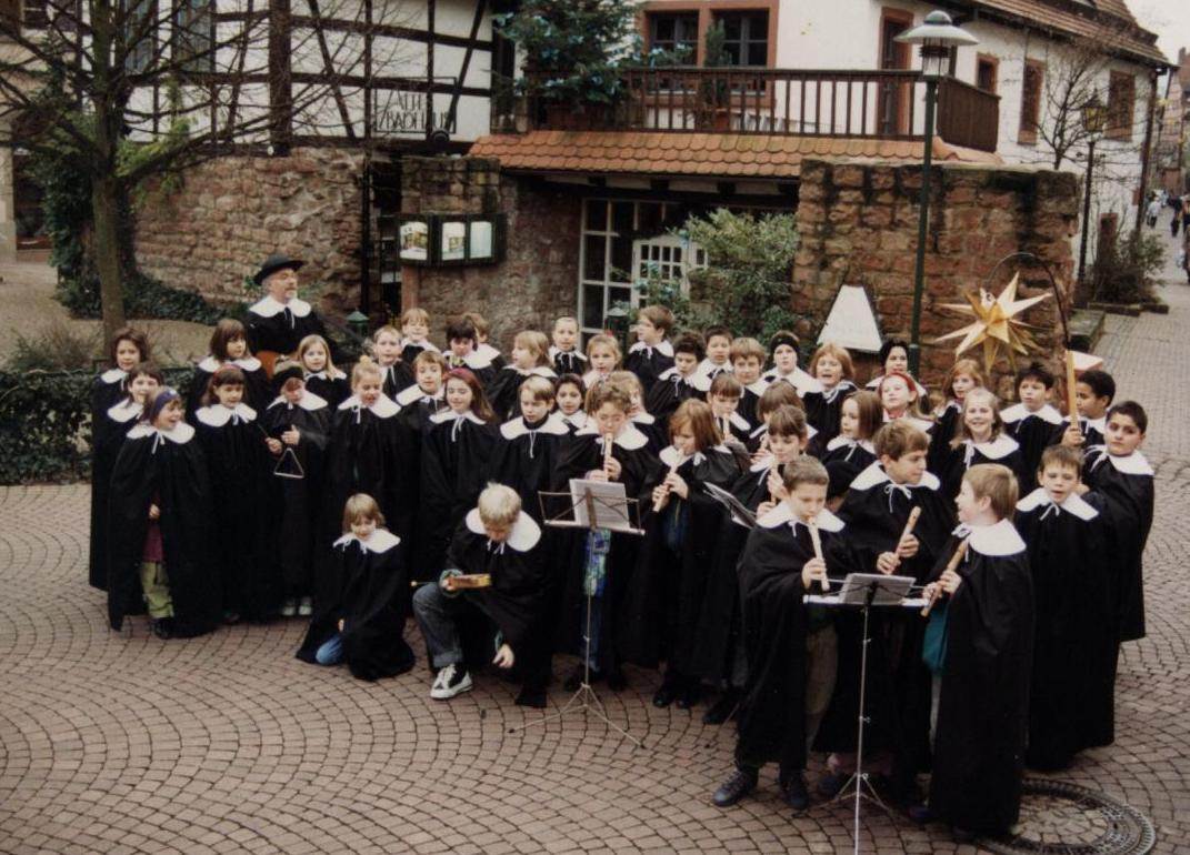 Die ältesten urkundlichen Belege über die laufenden Knabenchöre in Eberbach finden sich im Generallandesarchiv in Karlsruhe. In Schulakten von 1792 wird der Brauch beschrieben: „17 bis 18 Knaben“ werden „ernannt“, die die „Gesänge verrichten sollen“. Angeführt und geleitet wurden die Chöre meist von ihren Lehrern. Ein ausgeklügelter Einsatzplan sorgte für weihnachtliche Stimmung an allen Orten in der Stadt und quasi zu jeder Zeit.