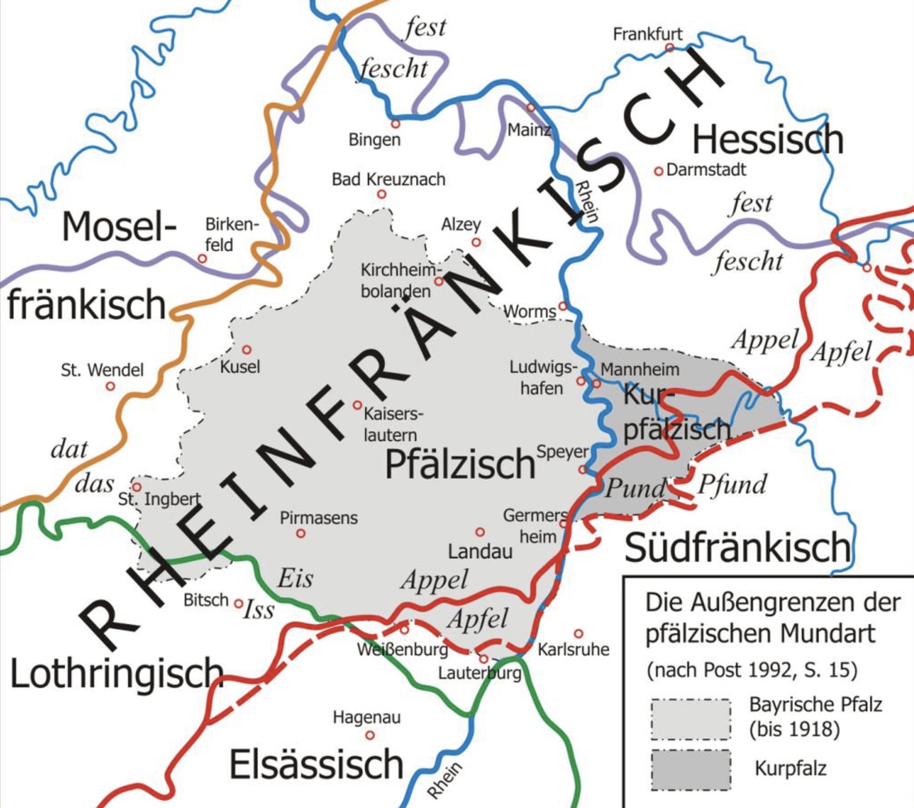 Im Südosten grenzt das Kurpfälzische an das Ostfränkische im nördlichen Württemberg, im Süden an das Südfränkische (Nordbadische). Allerdings ist die Abgrenzung des Kurpfälzischen nach Süden und Osten nicht ganz eindeutig festgelegt. Linguistisch korrekt ist es die Speyerer oder „Appel/Apfel-Linie“, die das Mitteldeutsche vom Oberdeutschen trennt , allerdings klassifizieren die meisten Bewohner der Gebiete um Sinsheim, [Eberbach], Bruchsal und Mosbach, die zur historischen Kurpfalz gehörten, ihren Dialekt selbst als Kurpfälzisch.