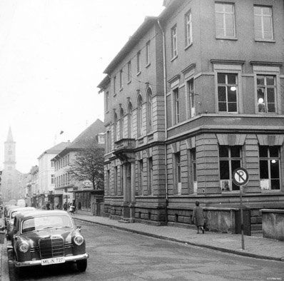 Das Haus in der Bahnhofstraße wurde 1886 gebaut. Neun Jahre später war es schon zu klein. 1904 musste die Dienstwohnung des Schulleiters zu einem Lehrsaal für Physik und Chemie umgebaut werden. 1914/15 dachte man erstmals an einen Neubau. 1949 wurde ein zweites Obergeschoss aufgesetzt. Dazu kamen noch vier behelfsmäßige Klassenzimmer an der Rückseite des Schulhofes. Eine unverputzte Baracke im Garten ergänzte das Raumangebot für eine Klasse und mit einer Toilettenanlage plus Fahrradkeller. Diese Bude trennte den Schulhof: In der linken Hälfte drehten sich die unteren Schulklassen während der Pausen artig im Kreis, im rechten Teil konnte sich die Oberstufe unbeeindruckt entspannen.