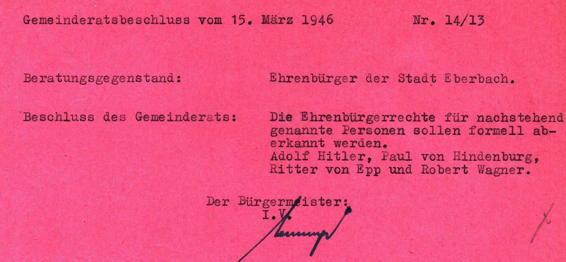 Am 15. März 1946 wurden die 1933 und 1934 in Eberbach bejubelten Ernennungen aberkannt