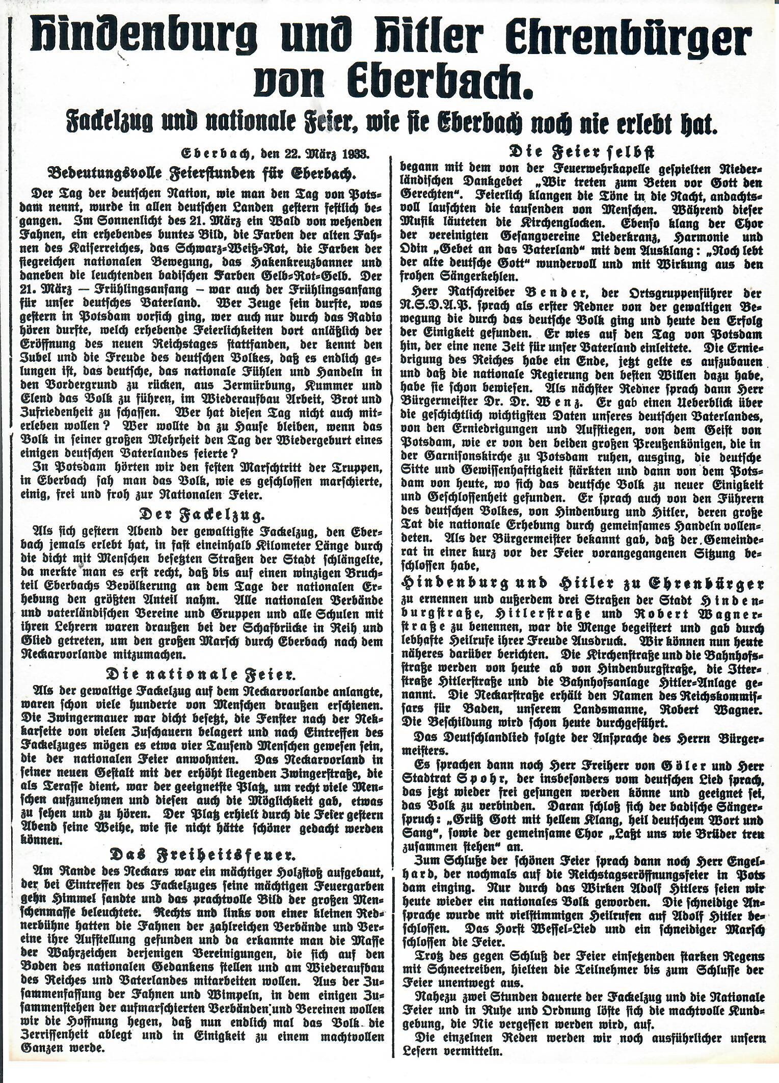 So feierte die Eberbacher Zeitung die neuen Ehrenbürger. Der Artikel vom 22. März 1933.
