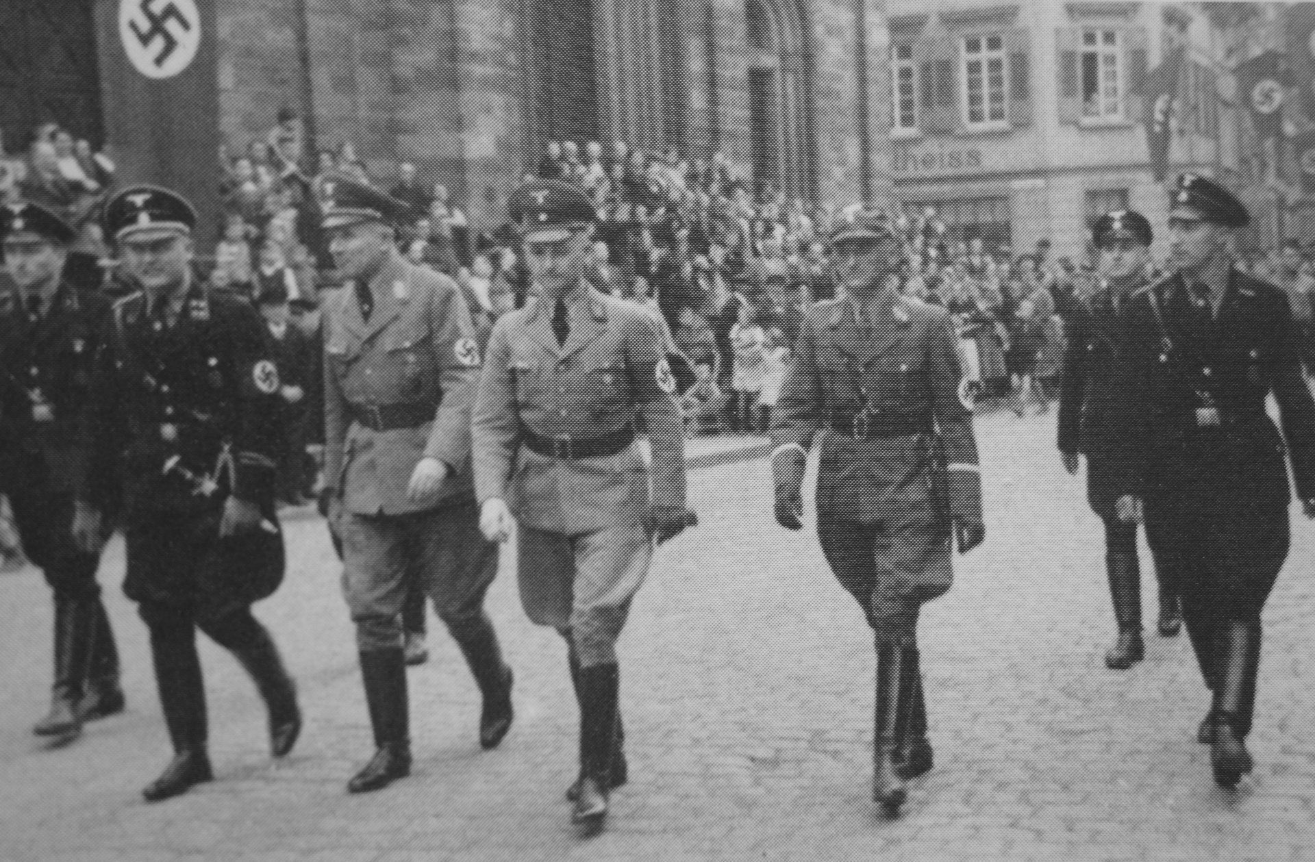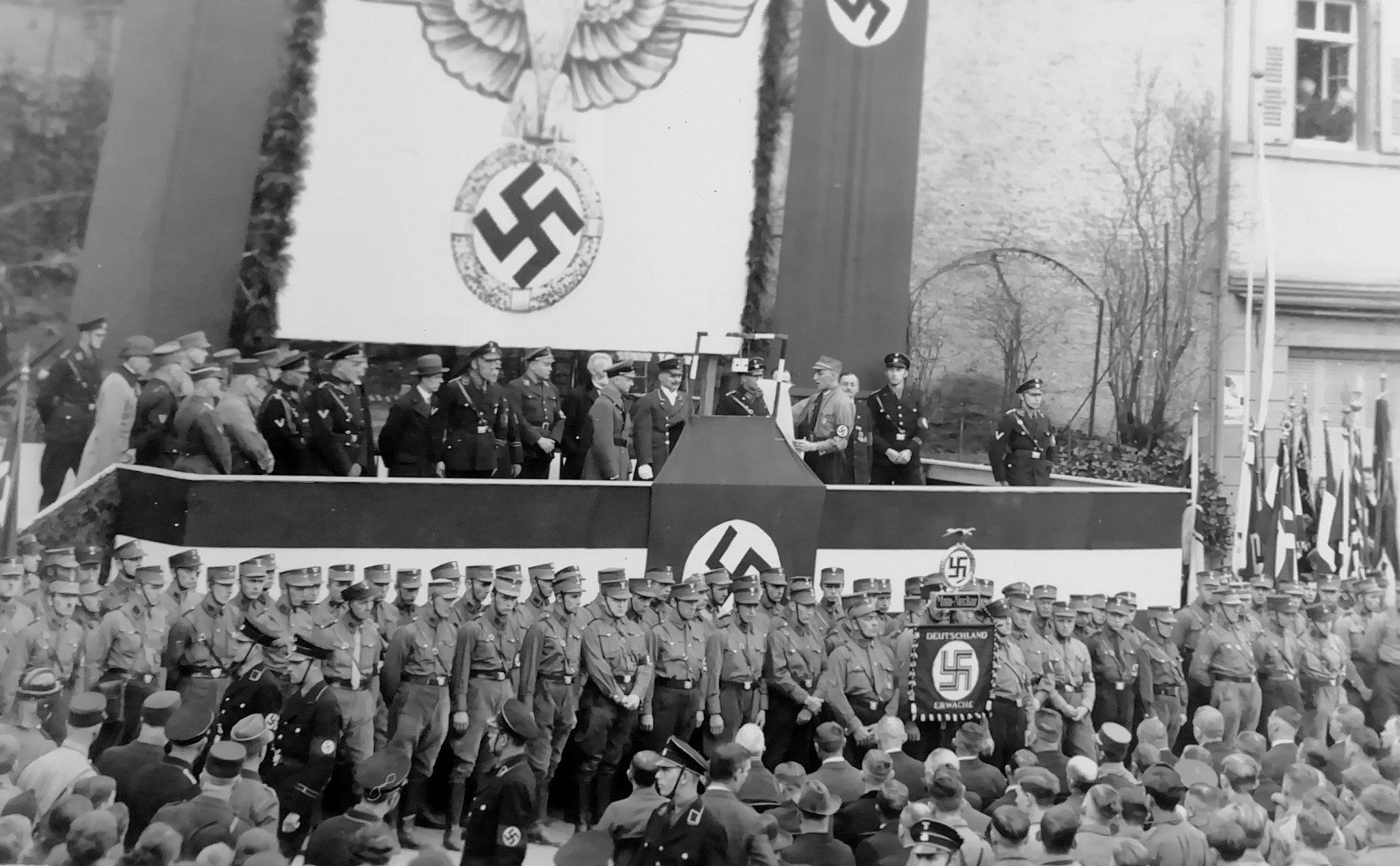 Berichtet wurde von nur „einem winzigen Bruchteil“, der nicht an der Straße stand und dem Aufmarsch der Vaterländischen beigewohnt hat. Eberbach und seine Häuser waren beflaggt - schwarz-weiß-rot, mit Hakenkreuz-Fahnen, in badischem Gold-Rot-Gold und in städtischem Blau-Weiß.