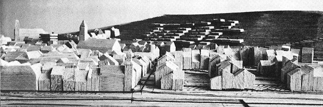Vorschläge von 1972. Viele neue Parkplätze und der Abriss der Dr.-Weiss-Schule mit dem Neubau eines Wohnviertels (rechts neben dem Blauen Hut, Mitte).